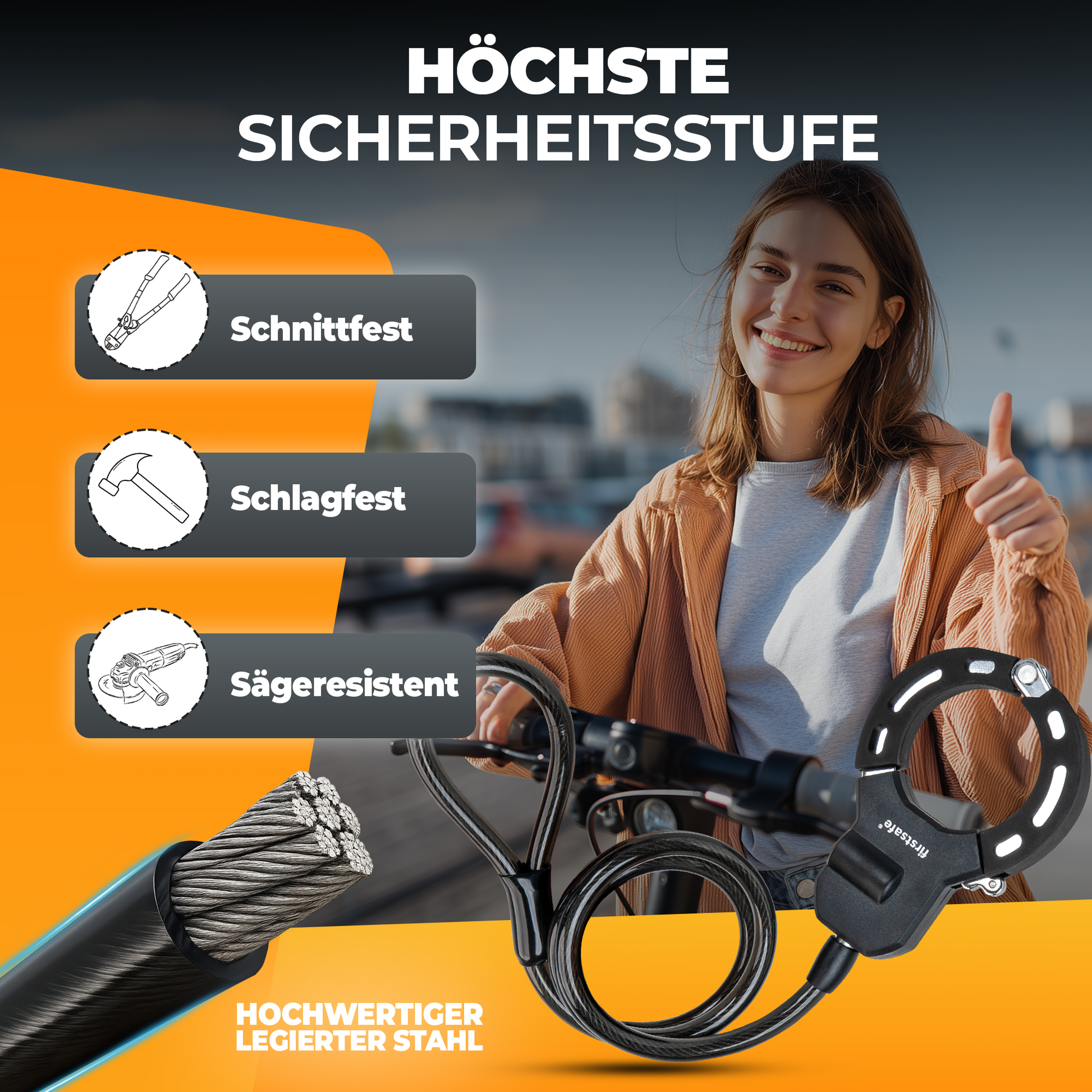 Das firstsafe® Handschellen-Kabelschloss bietet maximale Flexibilität bei gleichzeitig hoher Sicherheit. Durch die Kombination aus robuster Handschellenfunktion und beweglichem Kabel lässt sich dein E-Scooter oder Fahrrad auch an größeren oder unregelmäßigen Objekten schnell und sicher befestigen – ideal für den täglichen Einsatz.